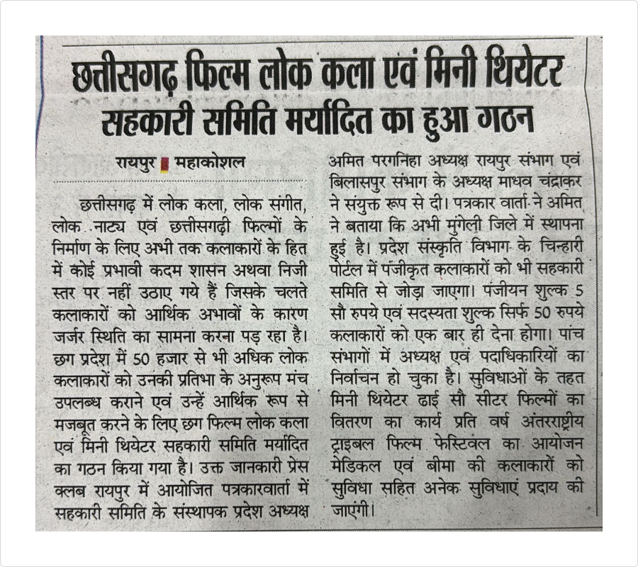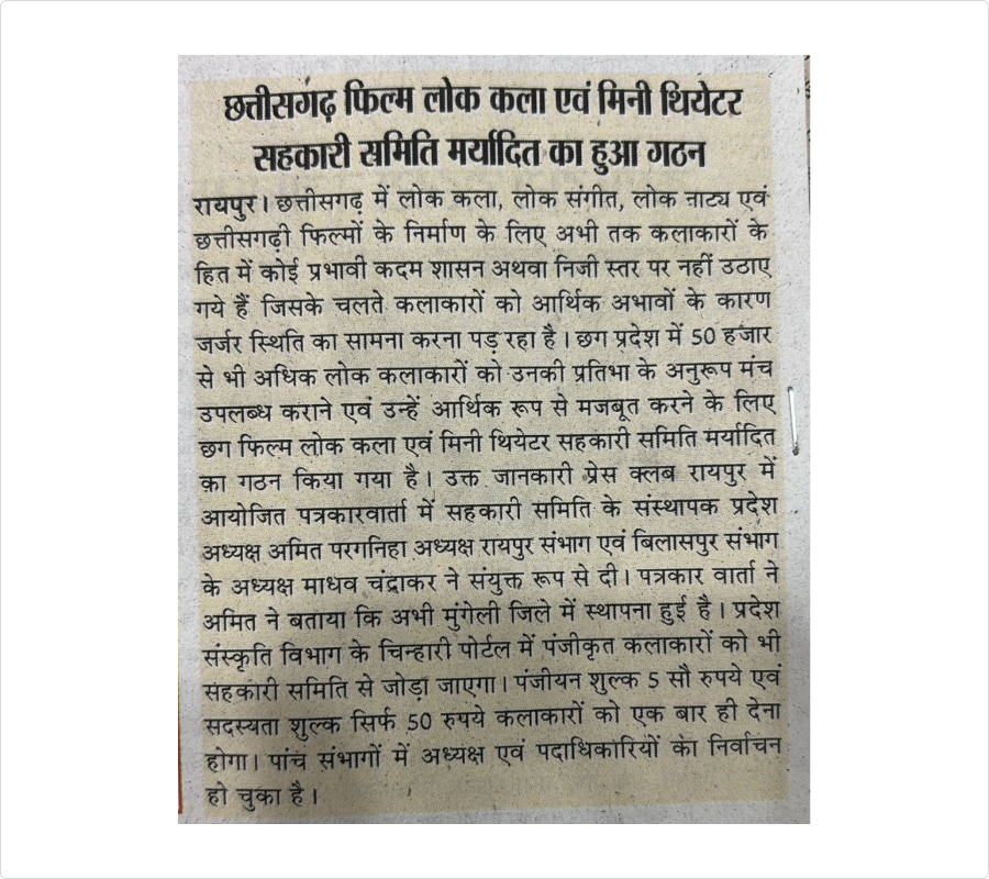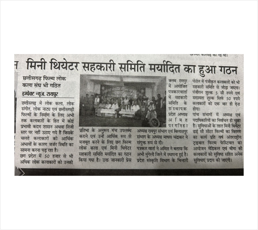 छत्तीसगढ़ का प्रथम एवं अपने उद्देश्यों के आधार पर भारत का प्रथम लोक कलाकारों , फिल्म कलाकारों एवं मिनी थिएटर की सहकारी समिति है।